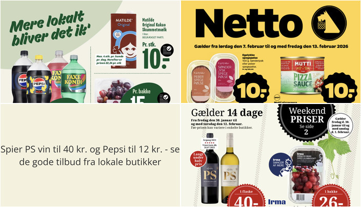 Hos Min Købmand kan du vælge mellem flere varianter af Pepsi, Faxe Kondi eller Mirinda til kun 12 kr. pr. flaske + pant. Tilbuddet gælder fra fredag den 6. februar til torsdag den 12. februar.